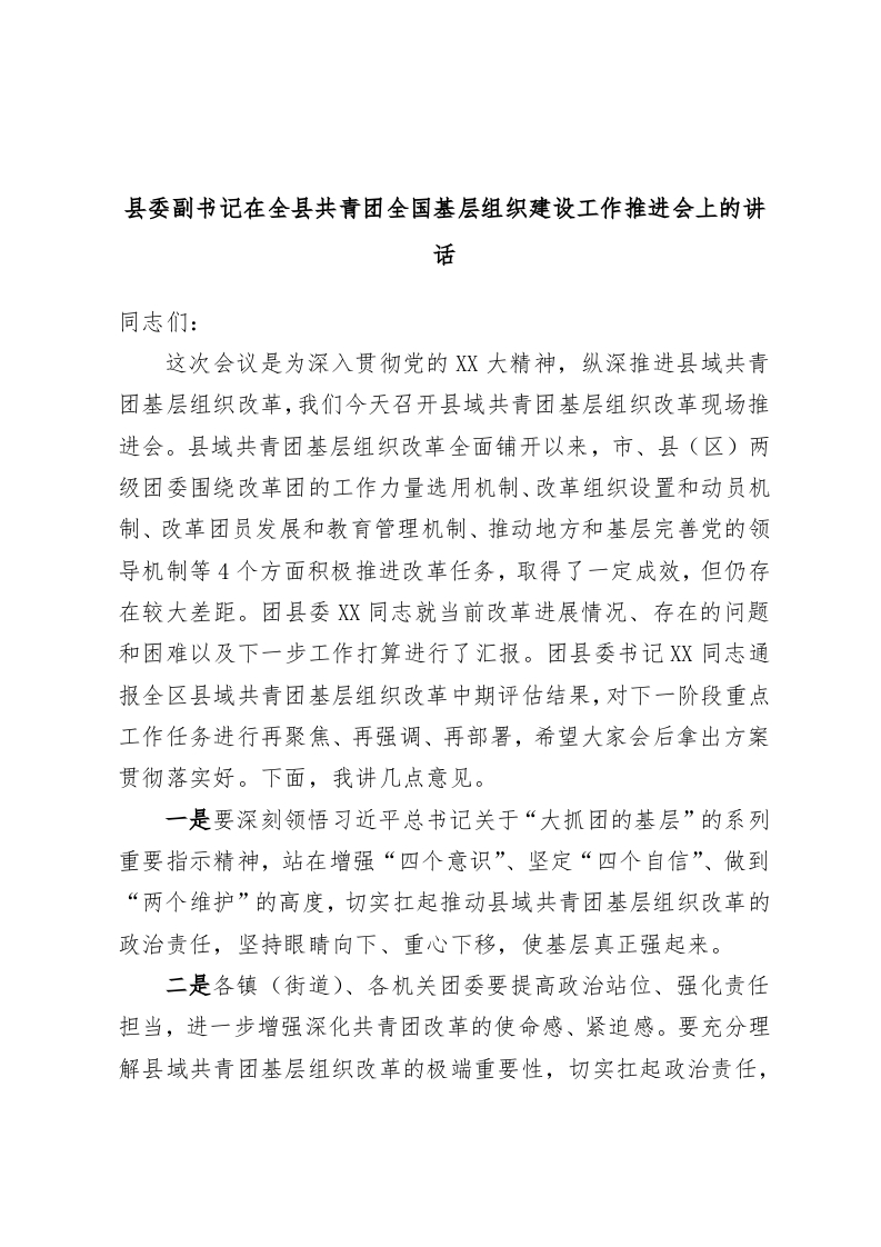/ 县委副书记在全县共青团全国基层组织建设工作推进会上的讲话
