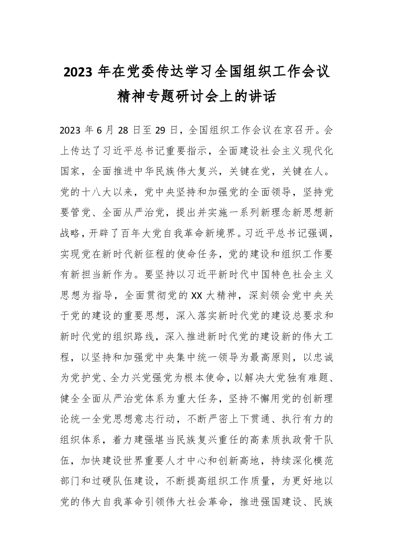 / 2023年在党委传达学习全国组织工作会议精神专题研讨会上的讲话