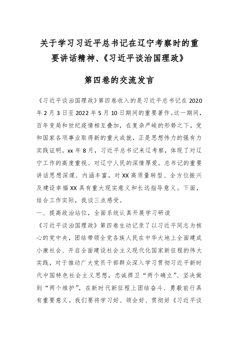 关于学习习近平总书记在辽宁考察时的重要讲话精神、《习近平谈治国理政》第四卷的交流发言