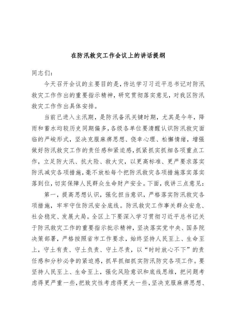 / 在防汛救灾工作会议上的讲话提纲