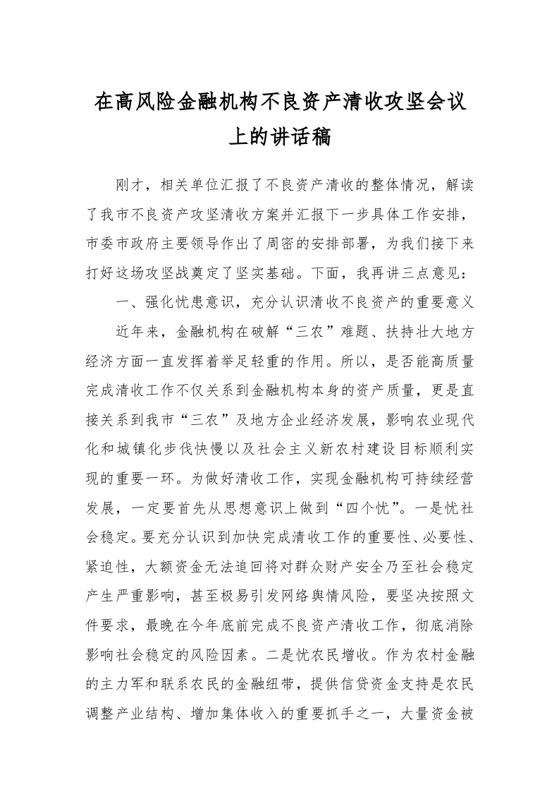 / 在高风险金融机构不良资产清收攻坚会议上的讲话稿