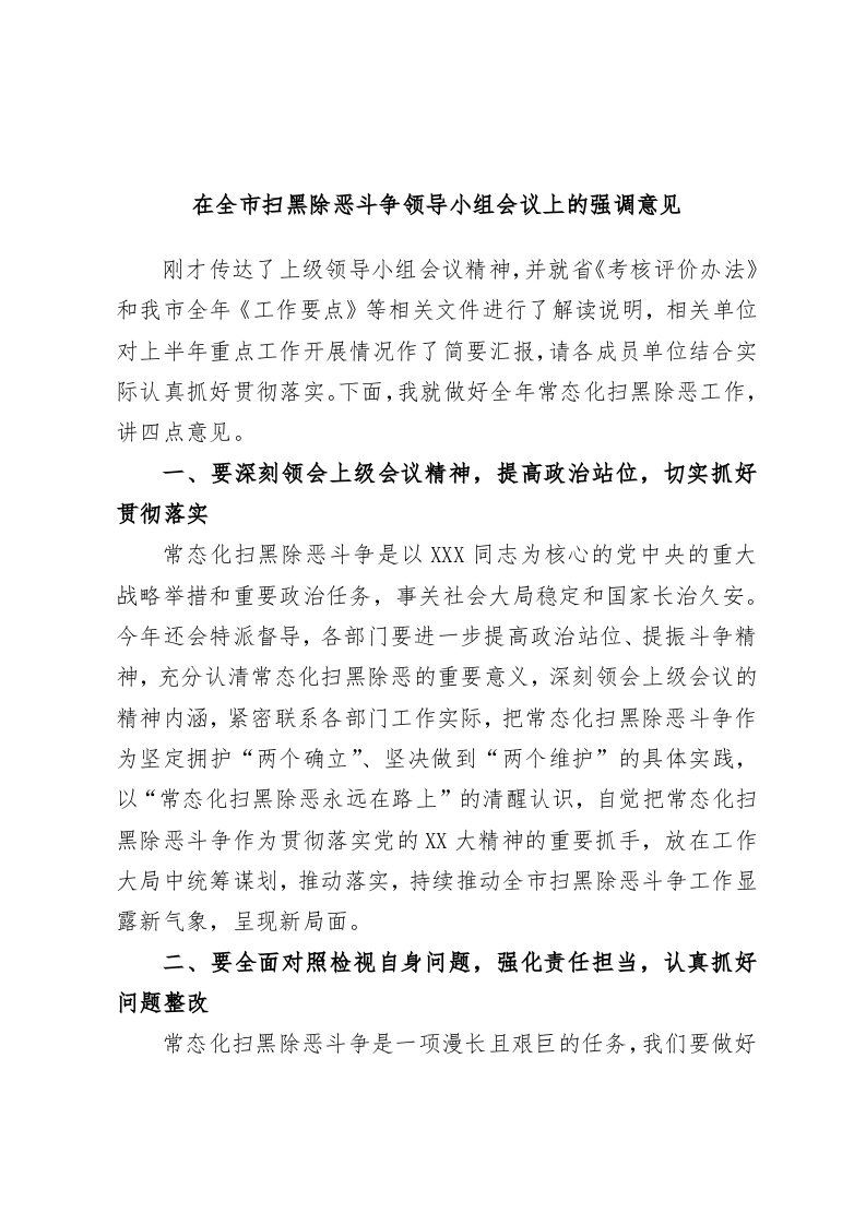 / 在全市扫黑除恶斗争领导小组会议上的强调意见