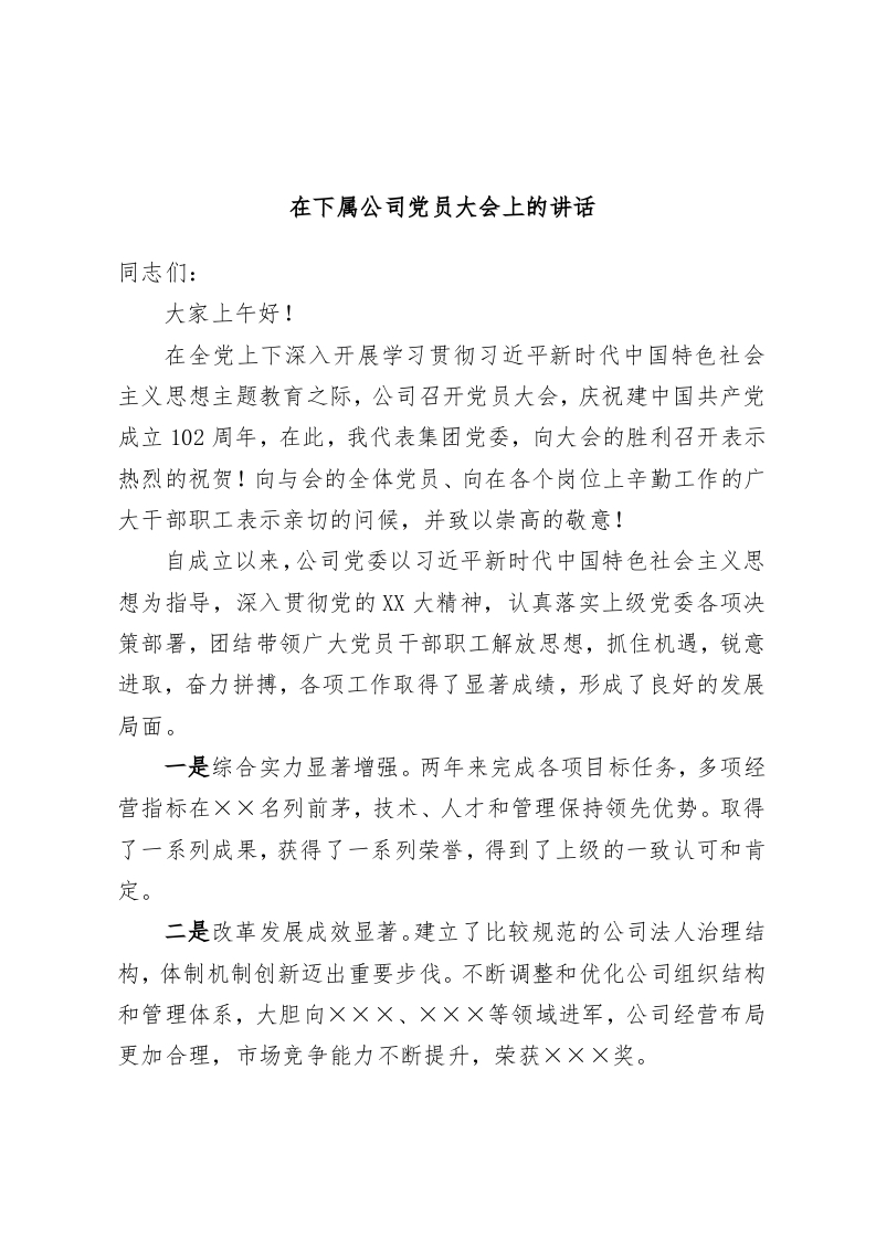 / 在下属公司党员大会上的讲话