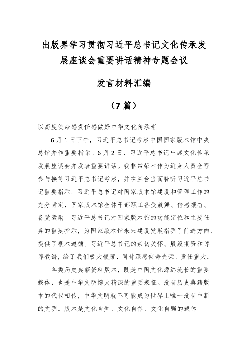 (7篇)关于出版界学习贯彻习近平总书记文化传承发展座谈会重要讲话精神专题会议发言材料