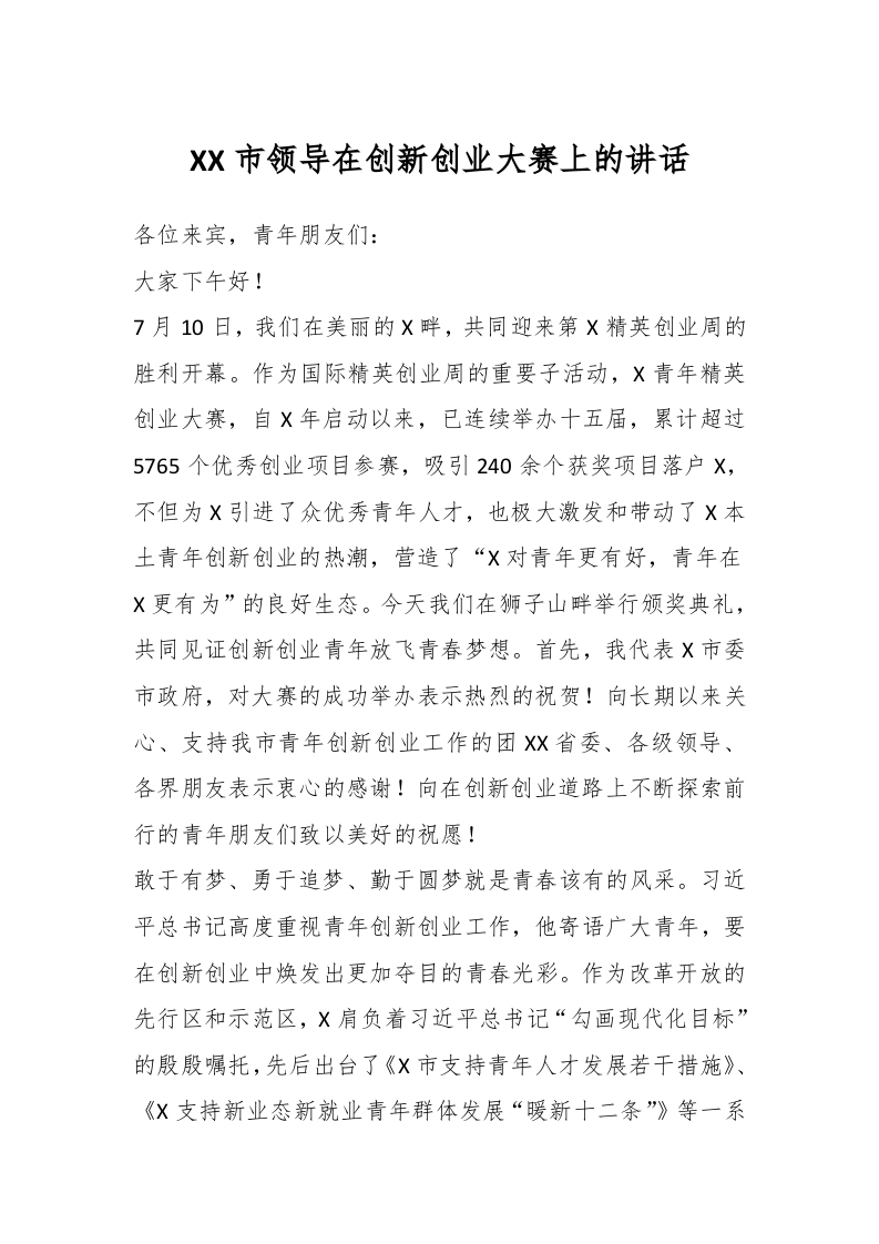 / XX市领导在创新创业大赛上的讲话