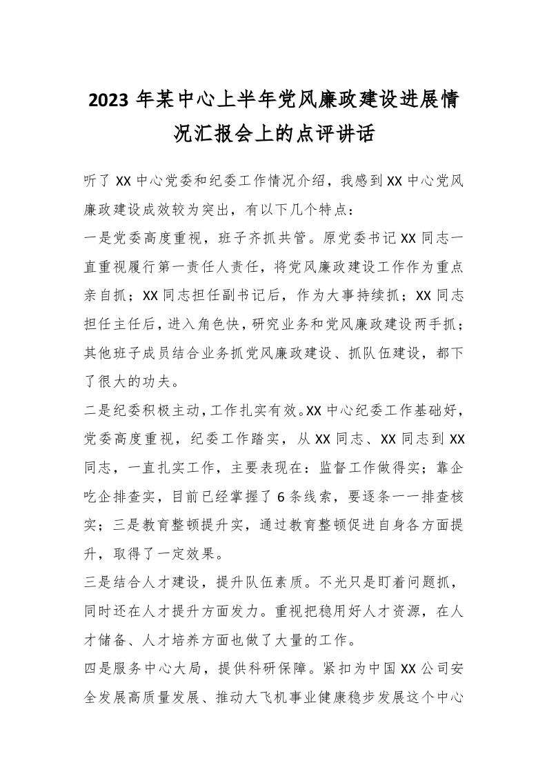 / 2023年某中心上半年党风廉政建设进展情况汇报会上的点评讲话