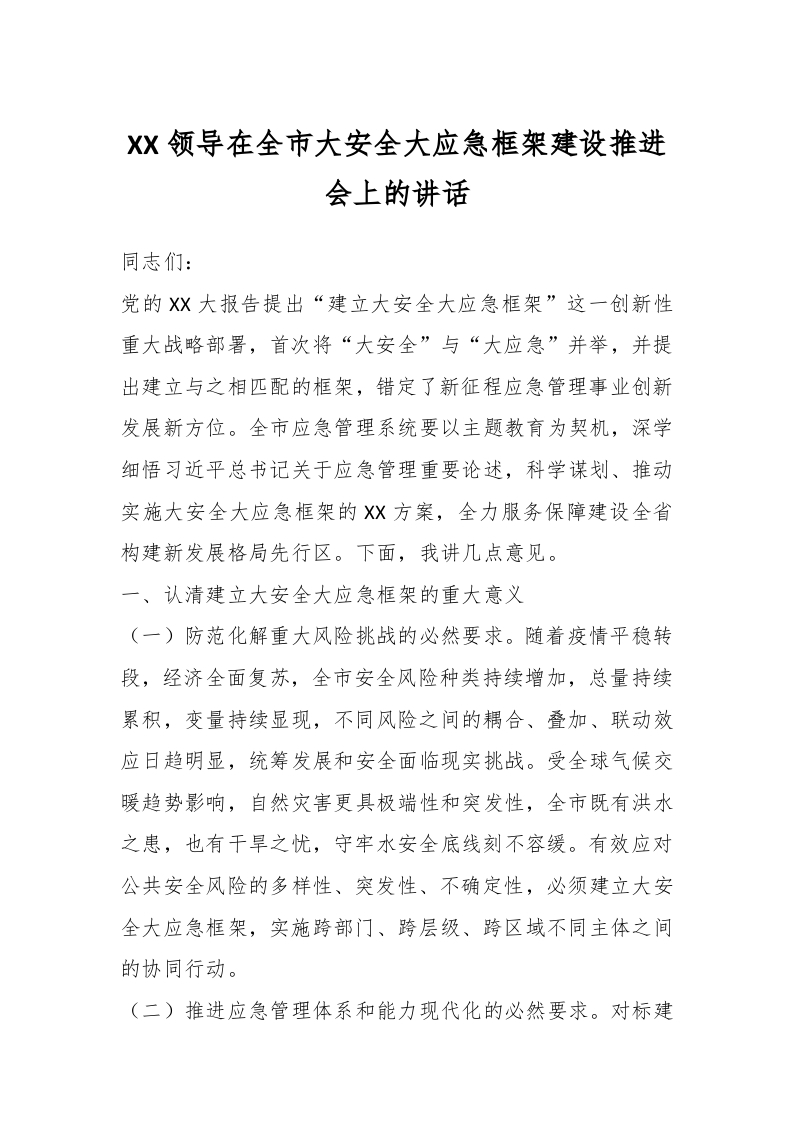 / XX领导在全市大安全大应急框架建设推进会上的讲话
