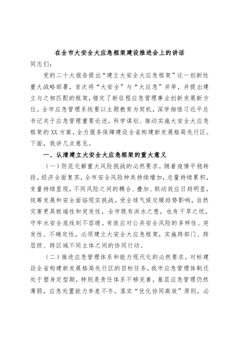 / 在全市大安全大应急框架建设推进会上的讲话