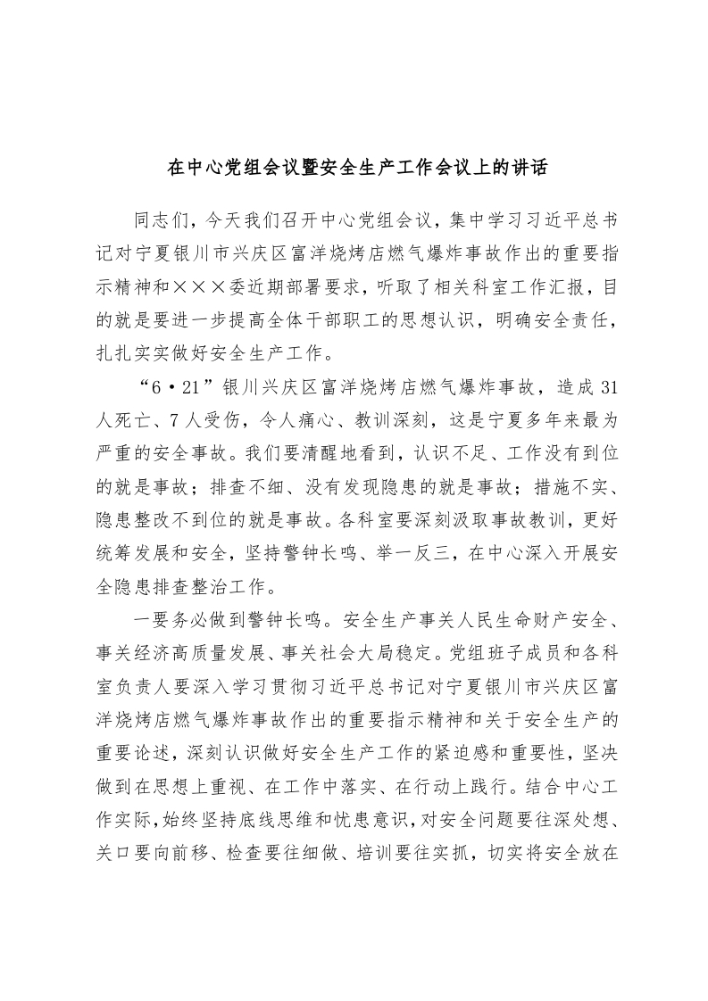 / 在中心党组会议暨安全生产工作会议上的讲话