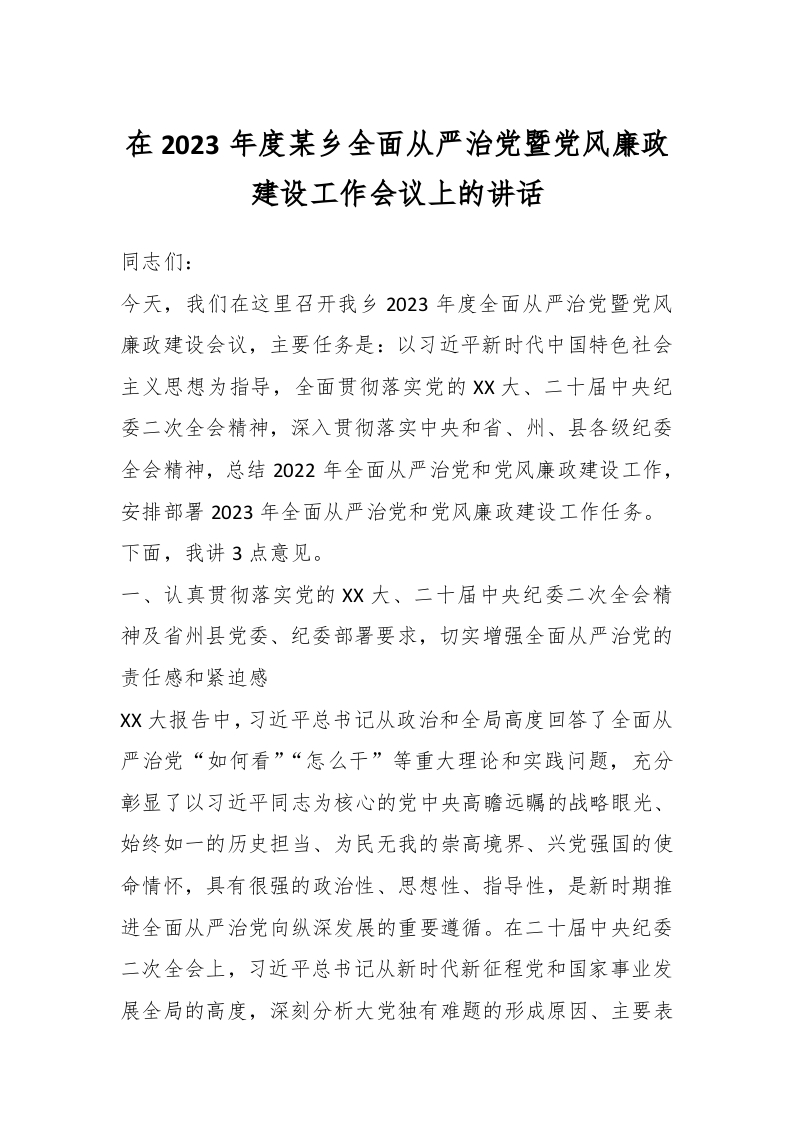 / XX领导在2023年度某乡全面从严治党暨党风廉政建设工作会议上的讲话