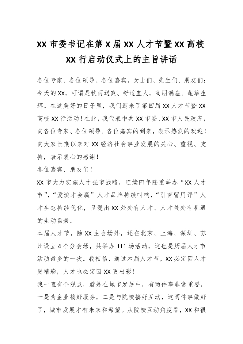 XX市委书记在第X届XX人才节暨XX高校XX行启动仪式上的主旨讲话