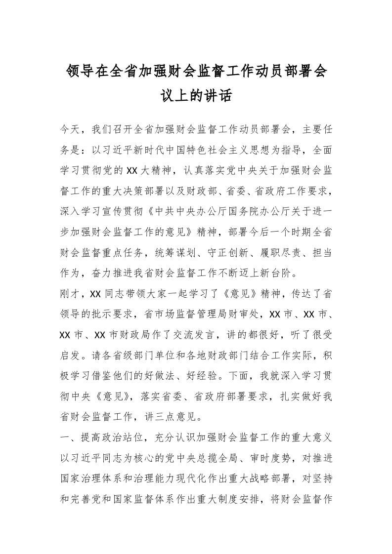 / 领导在全省加强财会监督工作动员部署会议上的讲话