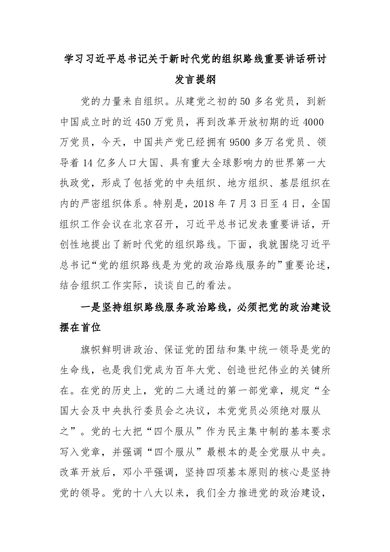 学习习近平总书记关于新时代党的组织路线重要讲话研讨发言提纲