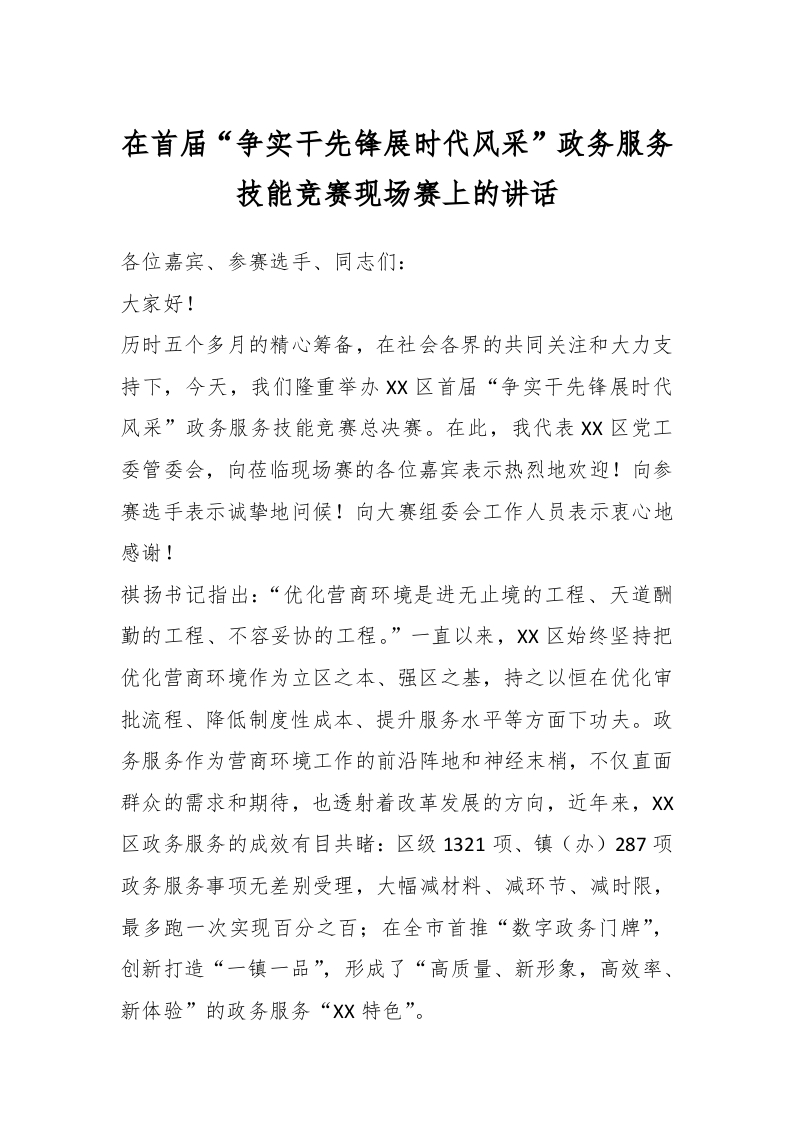 / 在首届“争实干先锋展时代风采”政务服务技能竞赛现场赛上的讲话