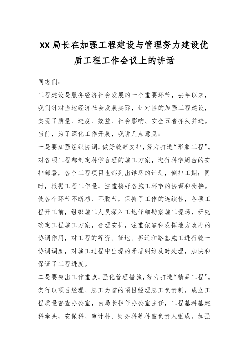 / XX局长在加强工程建设与管理努力建设优质工程工作会议上的讲话