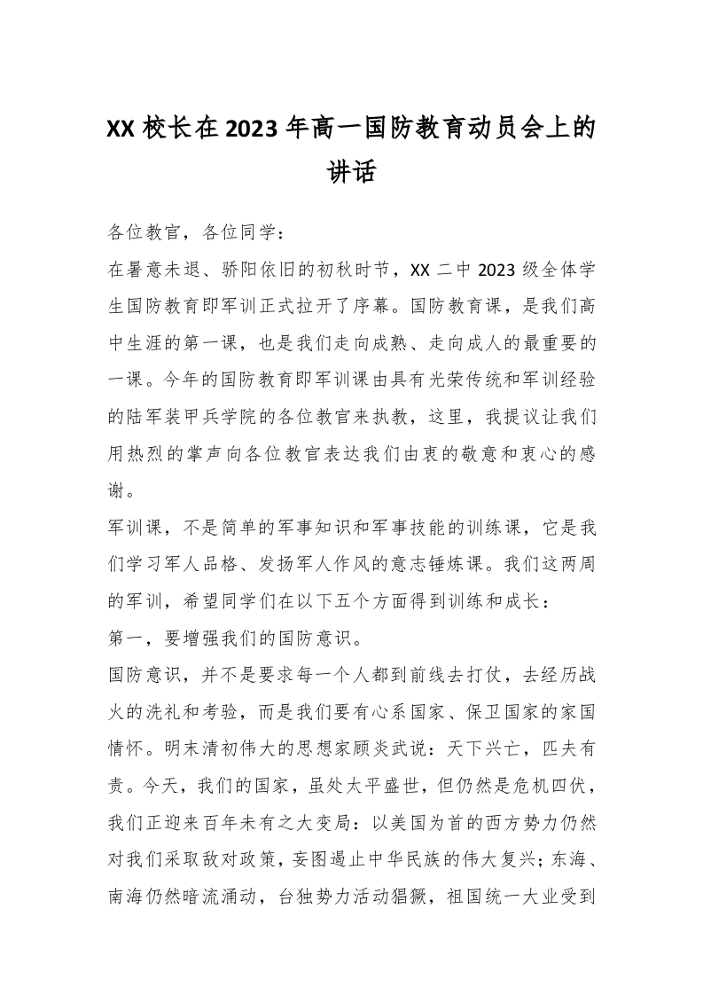 / XX校长在2023年高一国防教育动员会上的讲话