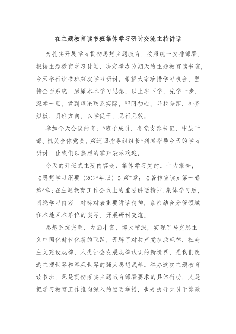 / 在主题教育读书班集体学习研讨交流主持讲话