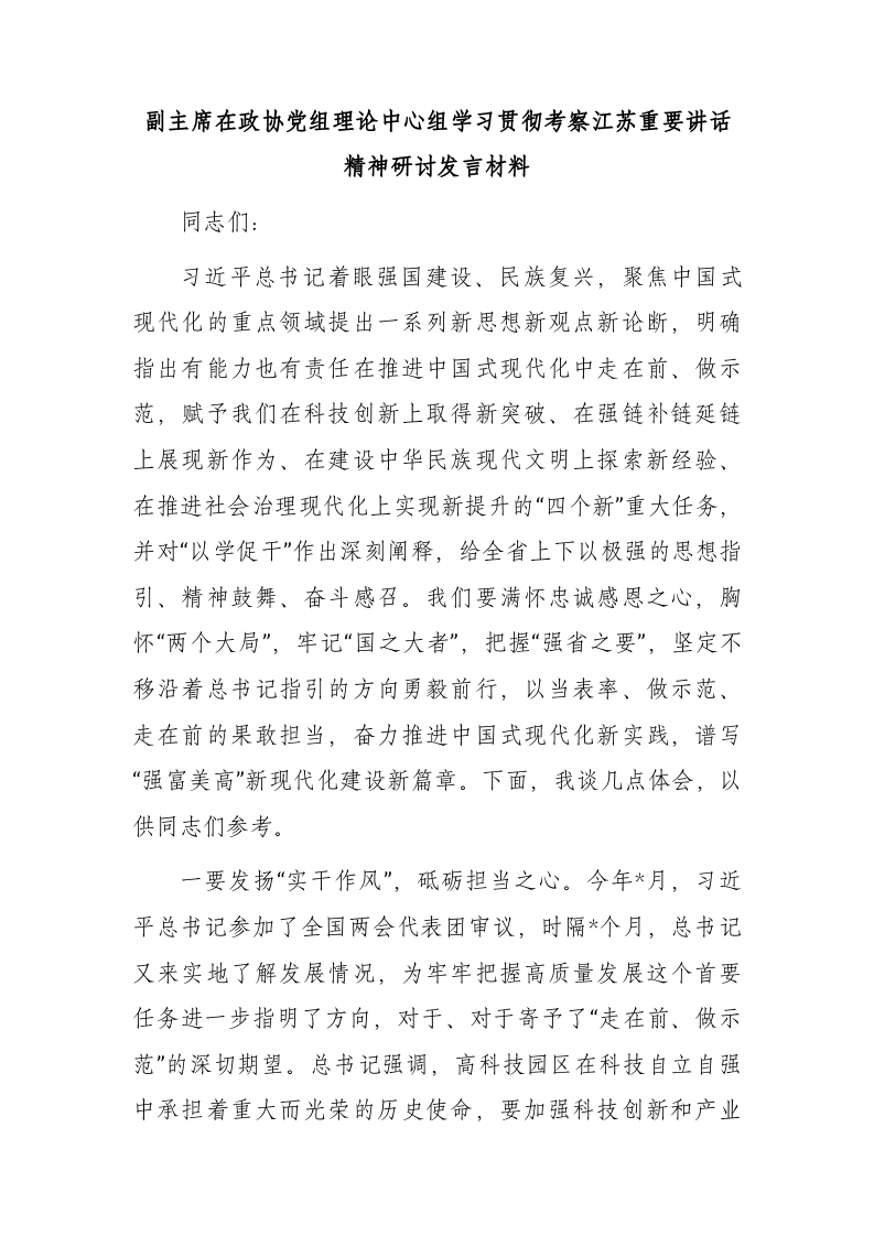 政协中心组学习贯彻考察江苏重要讲话精神研讨发言