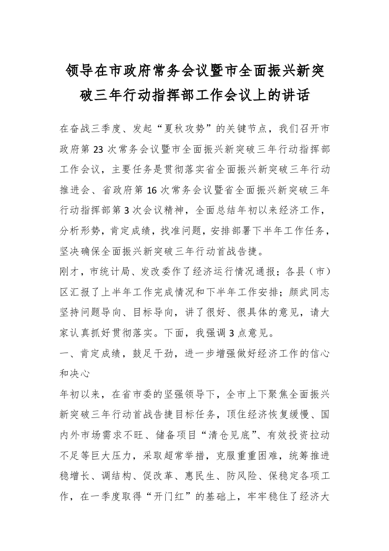 / 领导在市政府常务会议暨市全面振兴新突破三年行动指挥部工作会议上的讲话