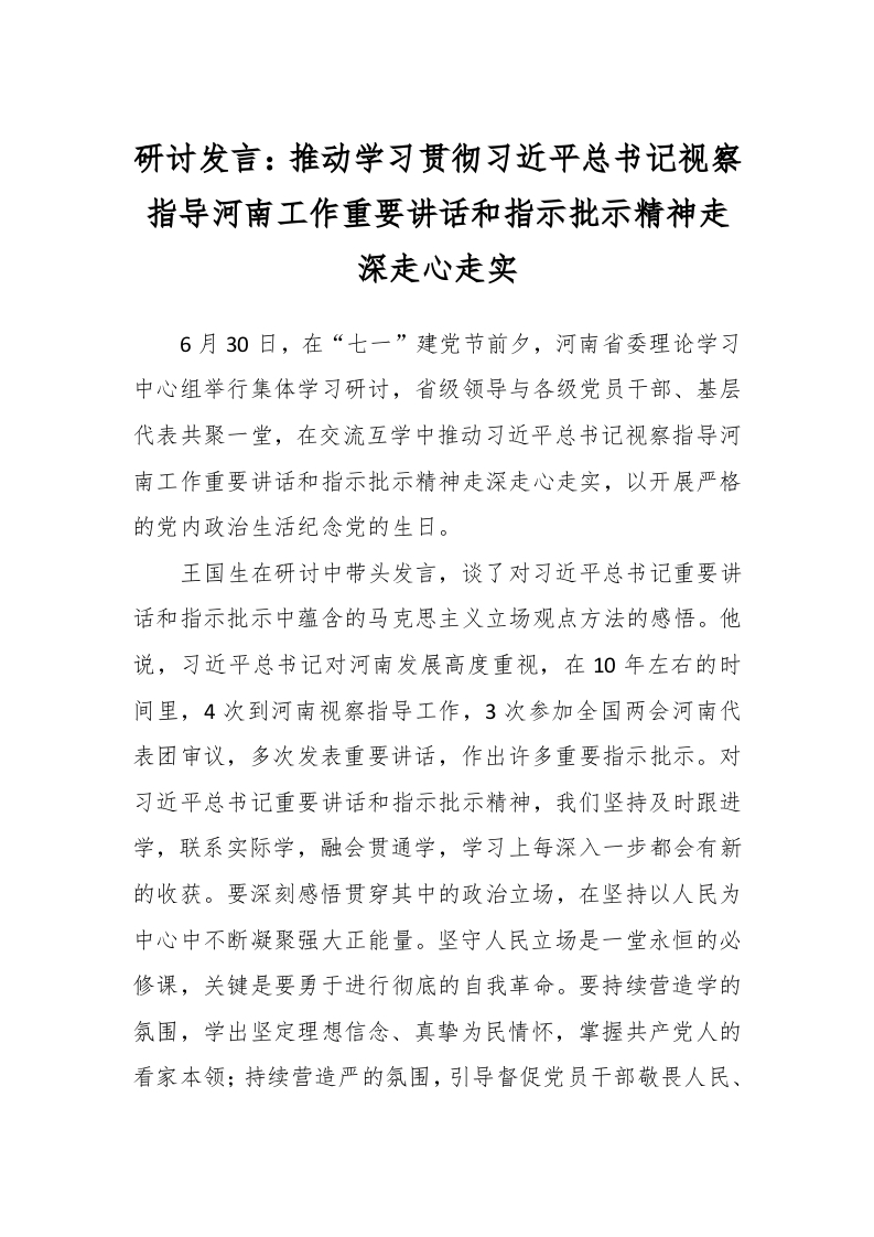 / 研讨发言:推动学习贯彻习近平总书记视察指导河南工作重要讲话和指示批示精神走深走心走实