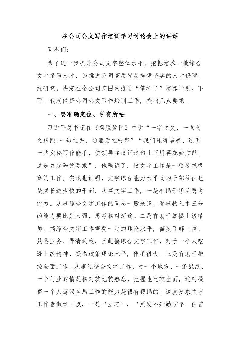 / 在公司公文写作培训学习讨论会上的讲话