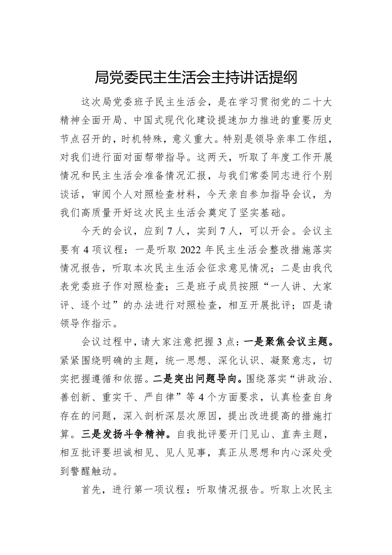 / 局党委民主生活会主持讲话提纲