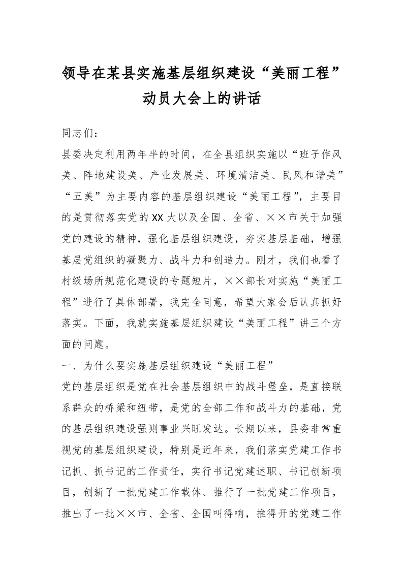/ 领导在某县实施基层组织建设“美丽工程”动员大会上的讲话