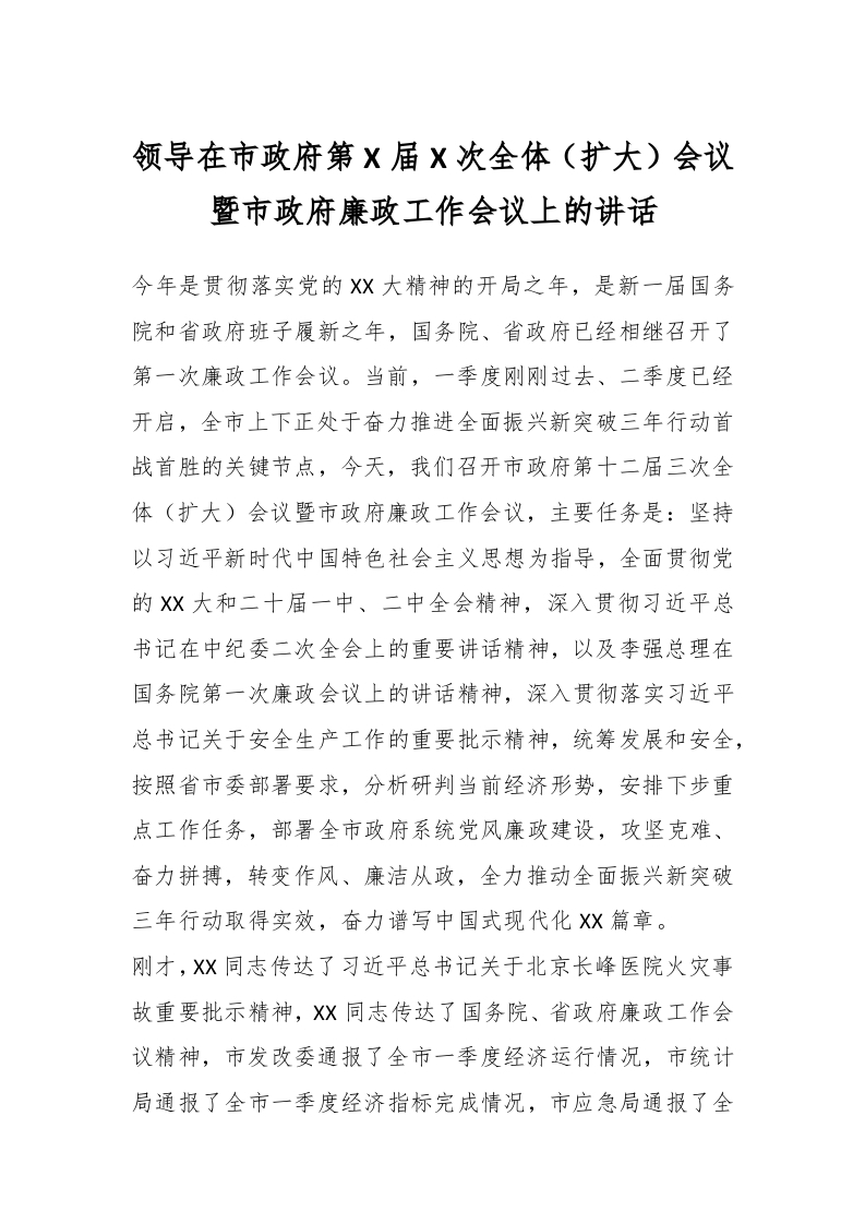 / 领导在市政府第X届X次全体(扩大)会议暨市政府廉政工作会议上的讲话