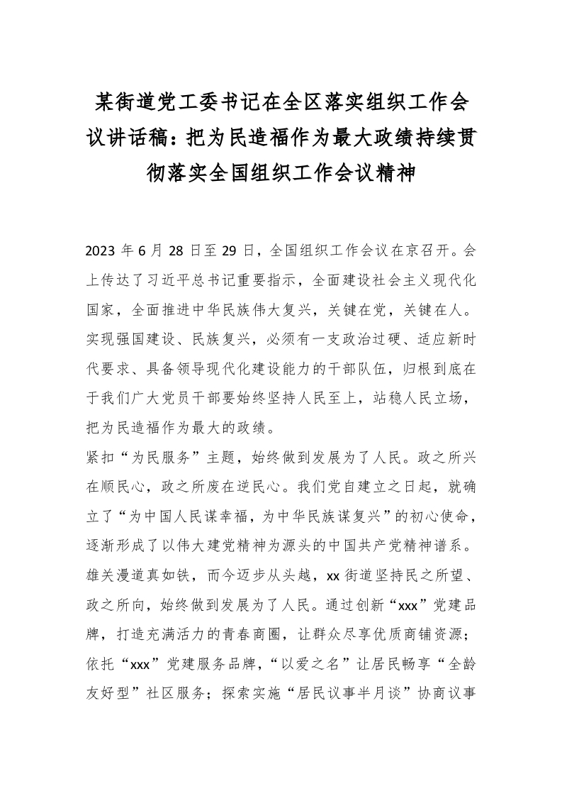 / 某街道党工委书记在全区落实组织工作会议讲话稿:把为民造福作为最大政绩持续贯彻落实全国组织工作会议精神
