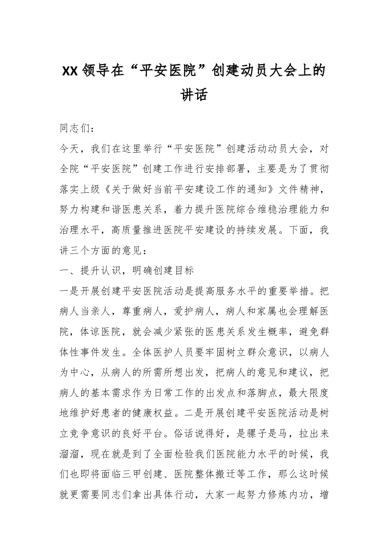 / XX领导在“平安医院”创建动员大会上的讲话