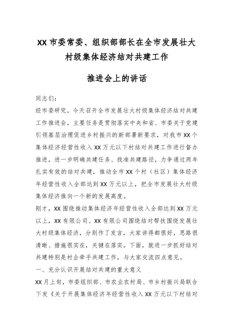/ XX市委常委、组织部部长在全市发展壮大村级集体经济结对共建工作推进会上的讲话