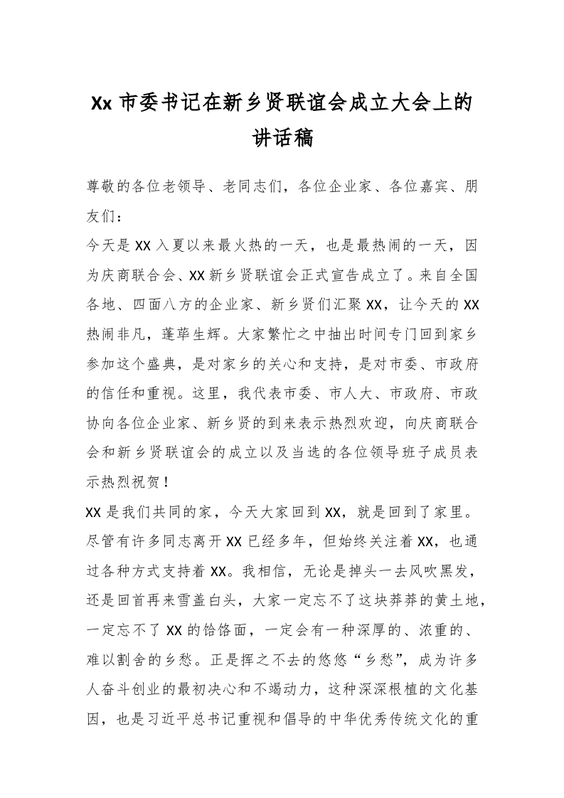 / Xx市委书记在新乡贤联谊会成立大会上的讲话稿