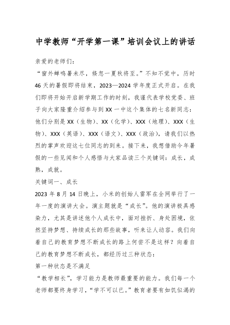 中学教师“开学第一课”培训会议上的讲话