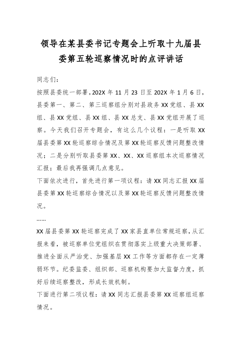/ 领导在某县委书记专题会上听取十九届县委第五轮巡察情况时的点评讲话