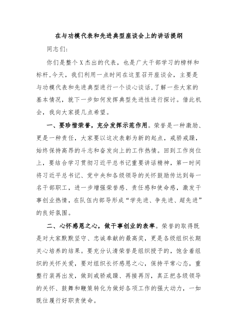 / 在与功模代表和先进典型座谈会上的讲话提纲