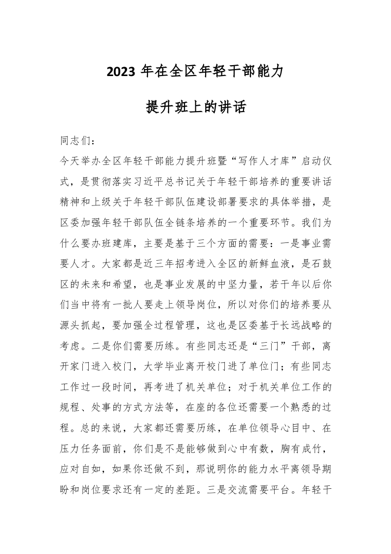 / 2023年在全区年轻干部能力提升班上的讲话