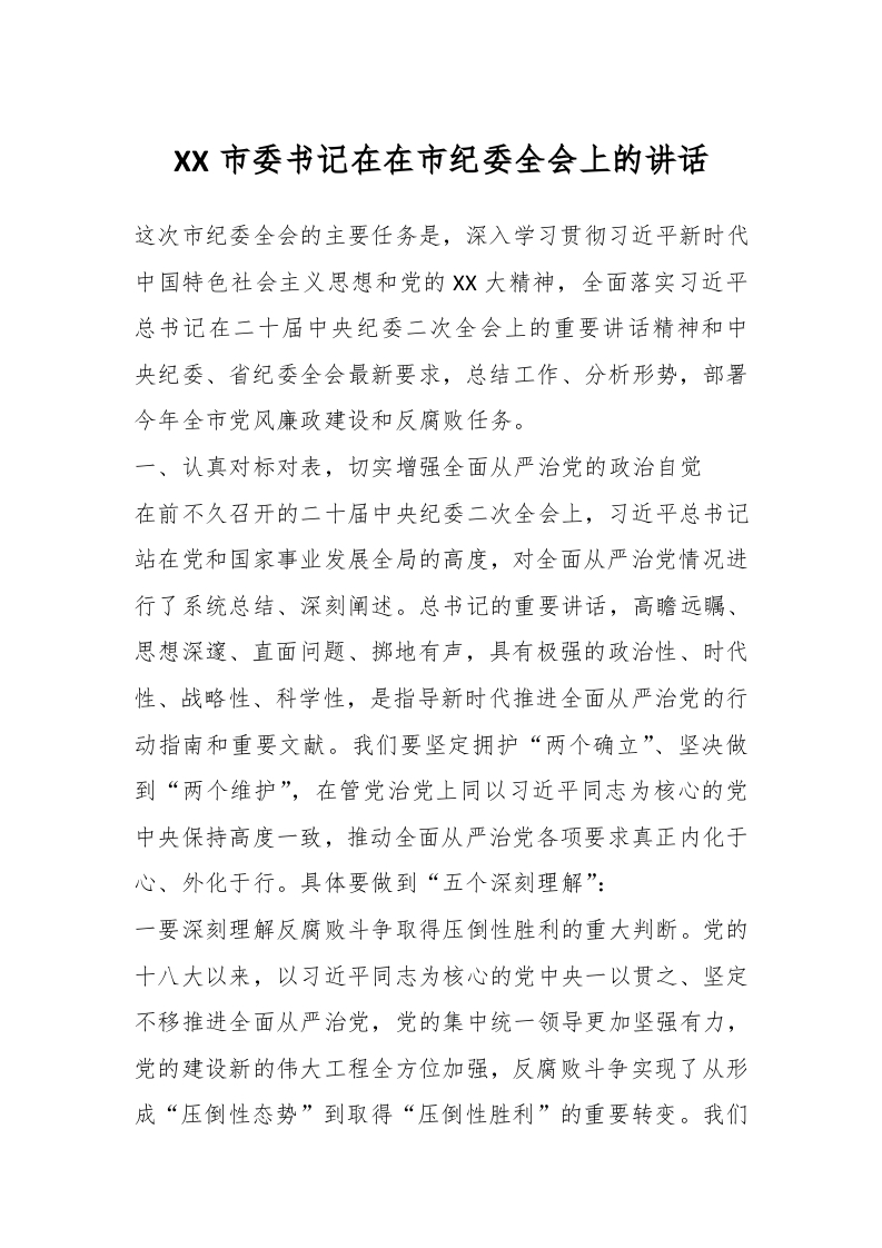 / XX市委书记在在市纪委全会上的讲话