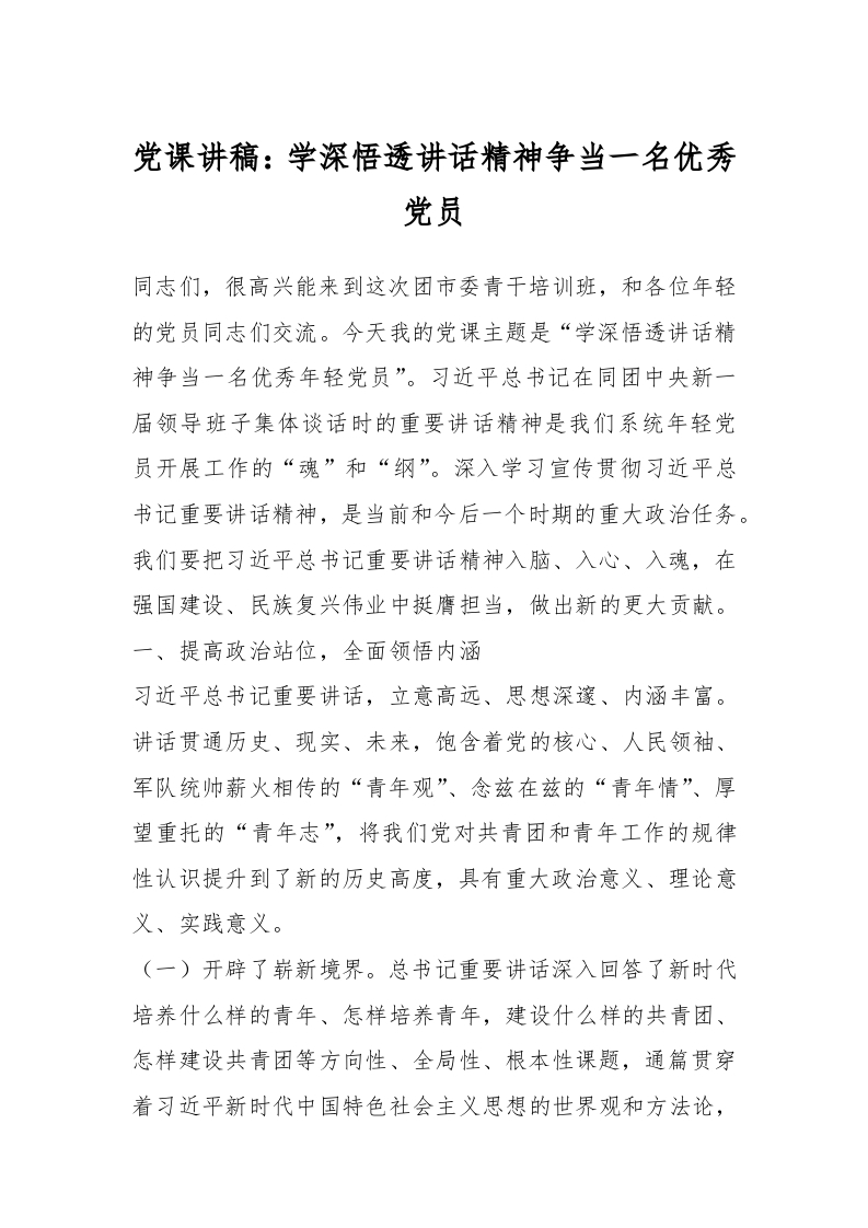 党课讲稿:学深悟透讲话精神争当一名优秀党员