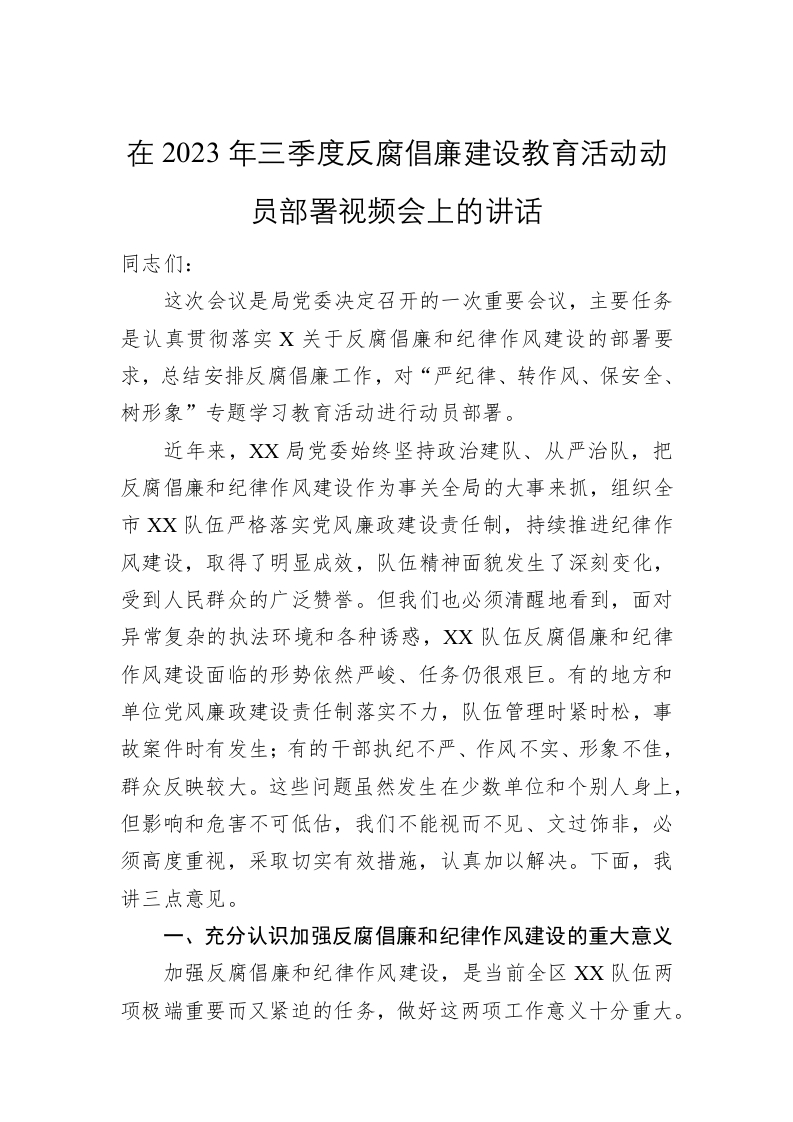 / 在2023年三季度反腐倡廉建设教育活动动员部署视频会上的讲话