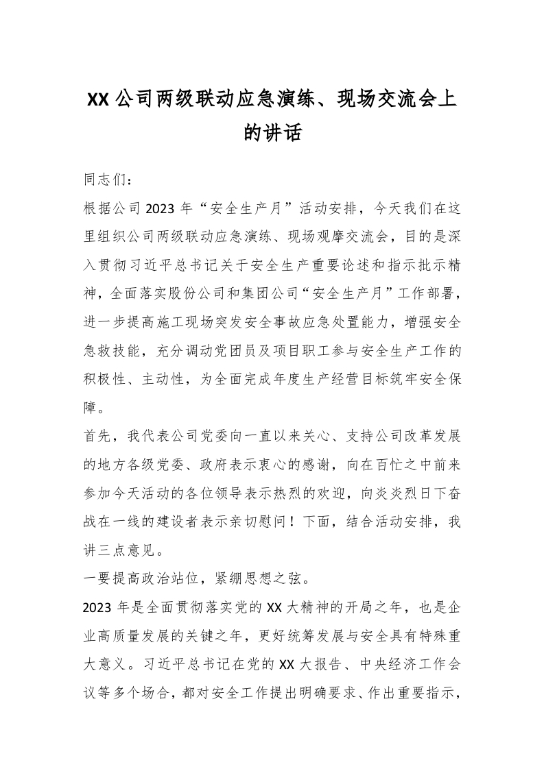 / XX公司两级联动应急演练、现场交流会上的讲话