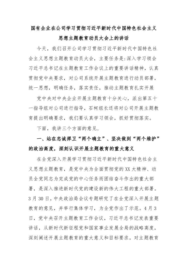 / 国有企业在公司学习贯彻习近平新时代中国特色社会主义思想主题教育动员大会上的讲话