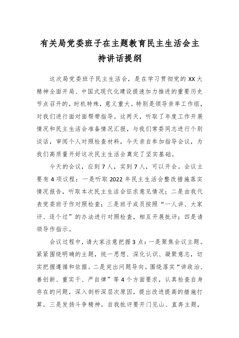 / 有关局党委班子在主题教育民主生活会主持讲话提纲