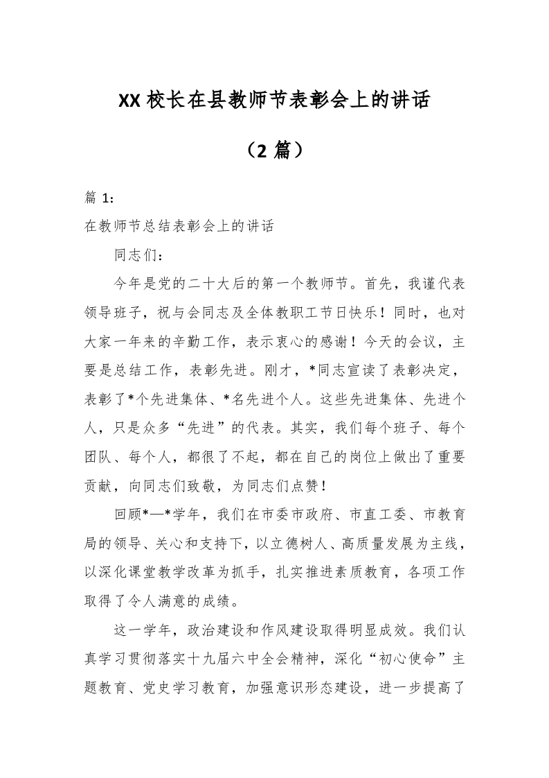 (2篇)XX校长在县教师节表彰会上的讲话