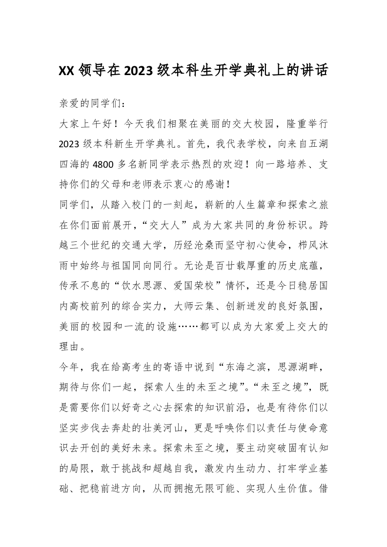 / XX领导在2023级本科生开学典礼上的讲话