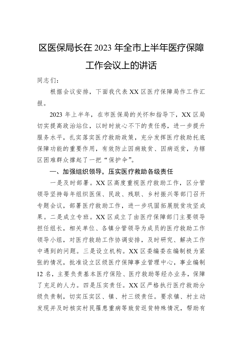 / 区医保局长在2023年全市上半年医疗保障工作会议上的讲话