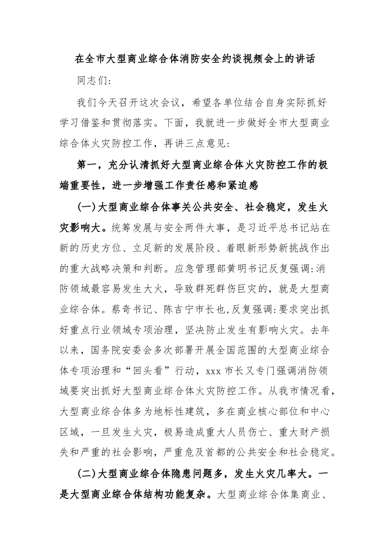 / 在全市大型商业综合体消防安全约谈视频会上的讲话