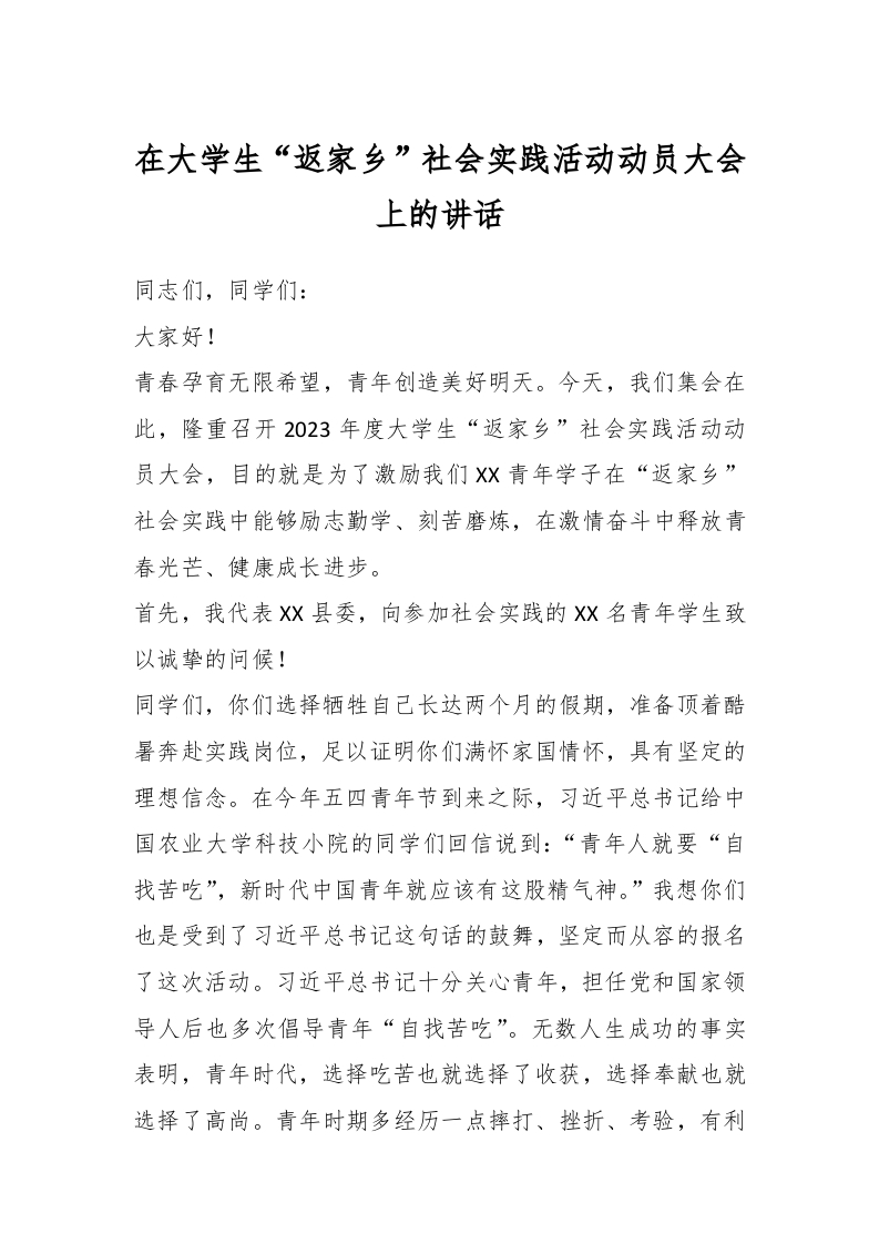 / 关于大学生“返家乡”社会实践活动动员大会上的讲话