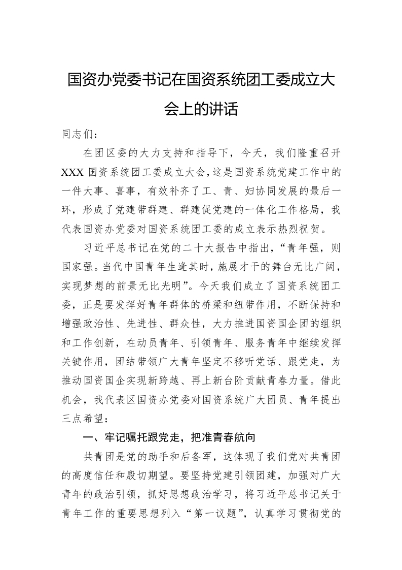 / 国资办党委书记在国资系统团工委成立大会上的讲话