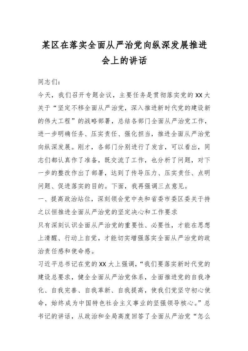 / 某区在落实全面从严治党向纵深发展推进会上的讲话