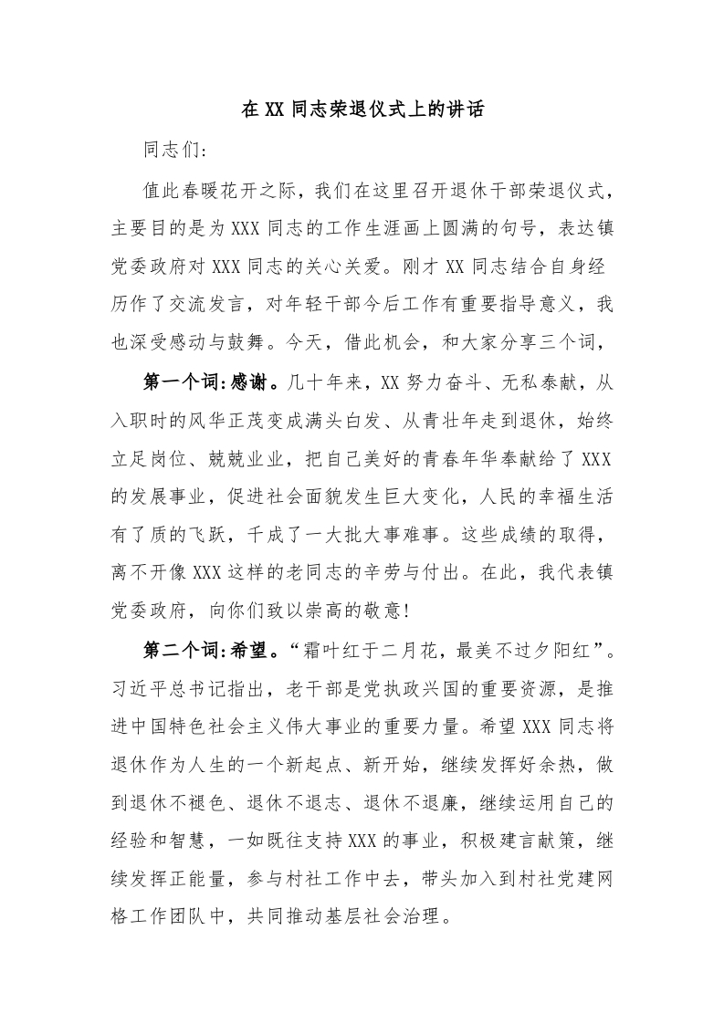 / 在XX同志荣退仪式上的讲话